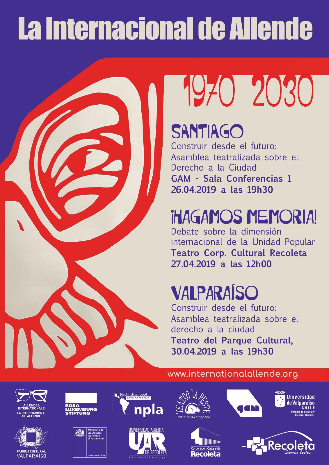 La Internacional de Allende en cooperación con la compañía Teatro La Peste generan una obra teatral participativa, organizada como un debate que investiga el Derecho a la Ciudad desde un hipotético escenario en el año 2030.En este espacio abierto se encontrarán tanto actores como testigos de la época y representantes reales de instituciones, organizaciones e iniciativas sociales. Juntos avanzan hacia una tomada de decisión que involucra como protagonista también al público presente.