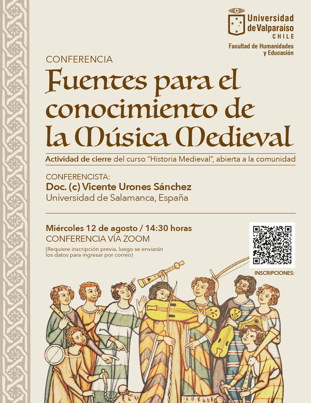 La conferencia, a realizarse mediante la plataforma Zoom, servirá como actividad de cierre para el curso “Historia Medieval”, patrocinado por la Facultad de Humanidades y Educación de la Universidad de Valparaíso. Como lo ha sido el curso, esta actividad es abierta a la comunidad, precisando para su participación solo de una inscripción previa en el siguiente enlace: