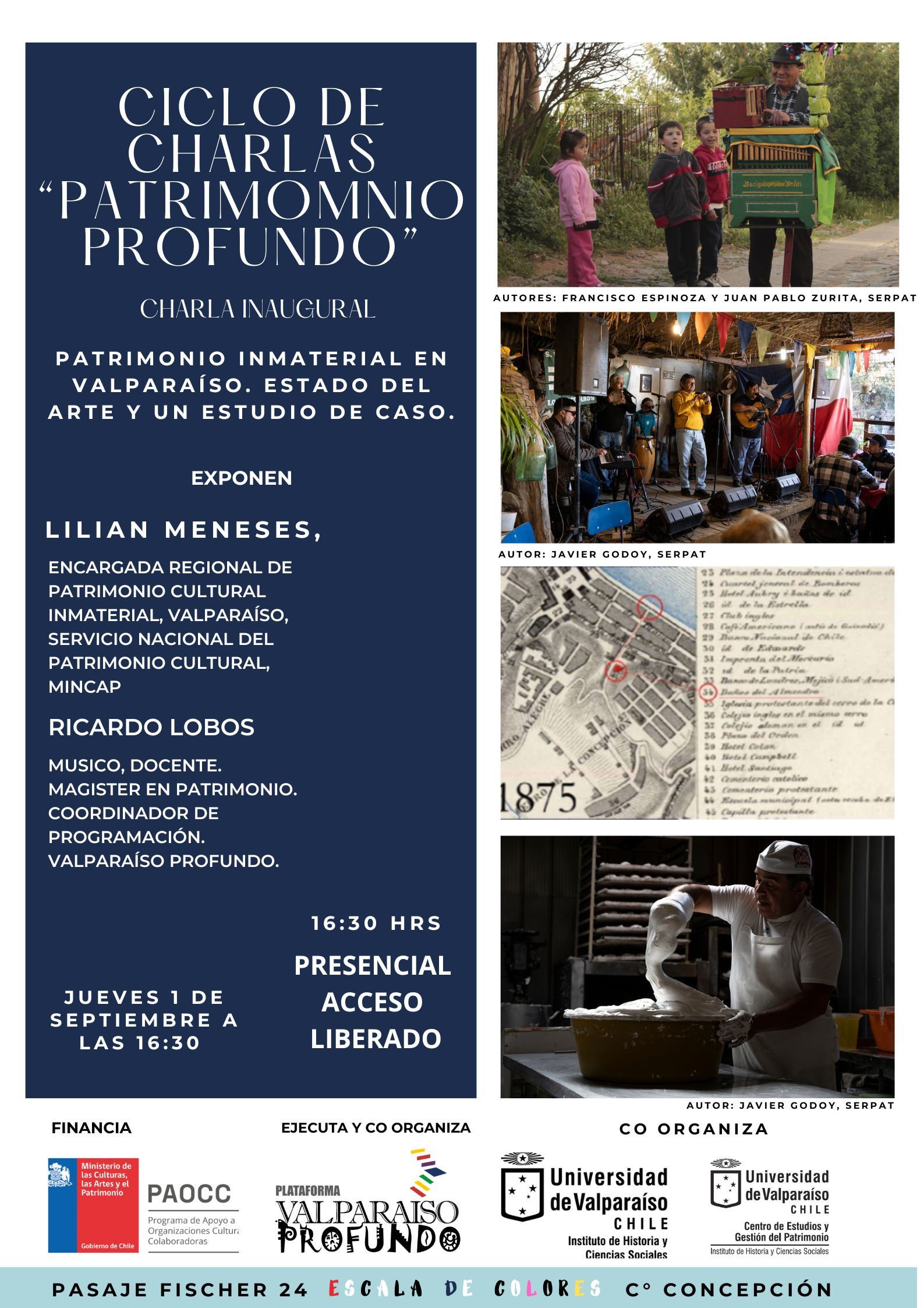 El Centro de estudios y gestión del patrimonio del Instituto de Historia y Ciencias Sociales de la Universidad de Valparaíso, invitan al primer encuentro del ciclo de charlas "Patrimonio profundo" a realizarse en Valparaíso Profundo, Fischer 24, el jueves 1 de septiembre a las 16:30 hrs. En esta oportunidad contaremos con la presencia de Lilian Meneses, socióloga, Magíster Arte y Patrimonio UPLA y encargada regional de patrimonio inmaterial del SERPAT, y Ricardo Lobos, músico, docente, Magíster en Patrimonio y Coordinador de Programación Valparaíso Profundo. Ambos abordaran la temática del patrimonio inmaterial en Valparaíso a partir de u estado del arte y de un caso de estudio como son los baños El Almendro.