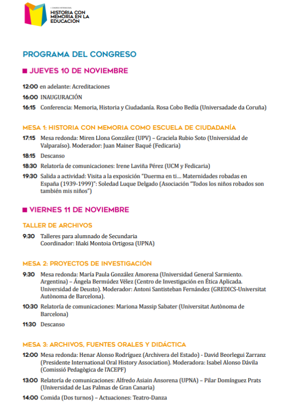 En el mismo contexto, la profesora Rubio ha sido invitada por el Instituto Navarro de la memoria y la Universidad Pública de Navarra a exponer en la Facultad de Ciencias Humanas y educación de esa universidad, en el evento: "La memoria en el aula: una mirada transnacional", en donde la profesora abordará las relaciones educativas entre historia y memoria y algunas orientaciones para la enseñanza.