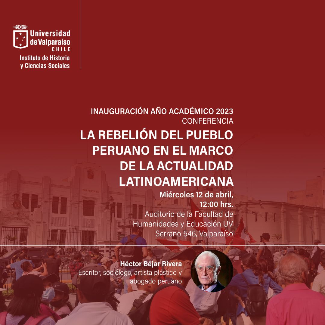 El miércoles 12 de abril a las 12:00 en el auditorio de la Facultad de Humanidades y Educación se dará inicio al año académico 2023 con la participación del destacado intelectual, artista y ensayista peruano Héctor Béjar Rivera, La conferencia lleva como título: "La Rebelión del Pueblo Peruano en el Marco de la Actualidad Latinoamerica".