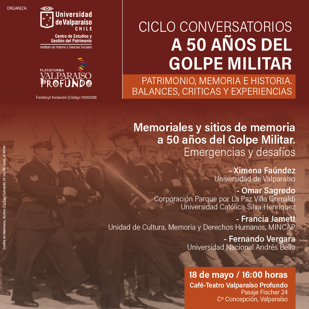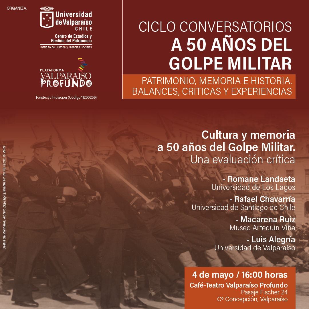 El Ciclo conversatorios a 50 años del Golpe Militar. Patrimonio, memoria e historia. Balances, críticas y experiencias, es una actividad organizada por el Centro de Estudios y Gestión del Patrimonio del Instituto de Historia y Ciencias Sociales de la Universidad de Valparaíso en conjunto con la Plataforma Valparaíso Profundo que posee, un doble eje, por un lado, se trata de una actividad conmemorativa en el marco de los 50 años del Golpe de Estado en Chile, y que además se realiza en el mes de mayo, reconocido como el mes del patrimonio en el país.