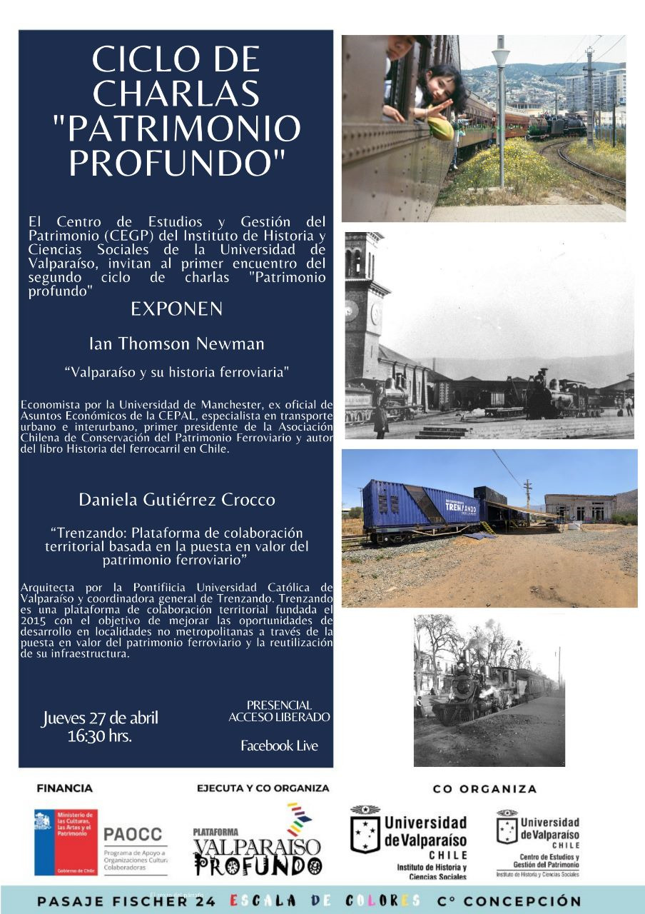 El Centro de Estudios y Gestión del Patrimonio (CEGP) del Instituto de Historia y Ciencias Sociales de la Universidad de Valparaíso, invitan al primer encuentro del segundo ciclo de charlas "Patrimonio profundo" a realizarse en el café y espaco cultural Valparaíso Profundo, Fischer 24, el jueves 27 de abril a las 16:30 hrs. En esta oportunidad contaremos con la presencia de Ian Thomson Newman, economista por la Universidad de Manchester, ex oficial de Asuntos Económicos de la CEPAL, especialista en transporte urbano e interurbano, primer presidente de la Asociación Chilena de Conservación del Patrimonio Ferroviario y autor del libro Historia del ferrocarril en Chile. Ian nos presentará una ponencia titulada “Valparaíso y su historia ferroviaria”.