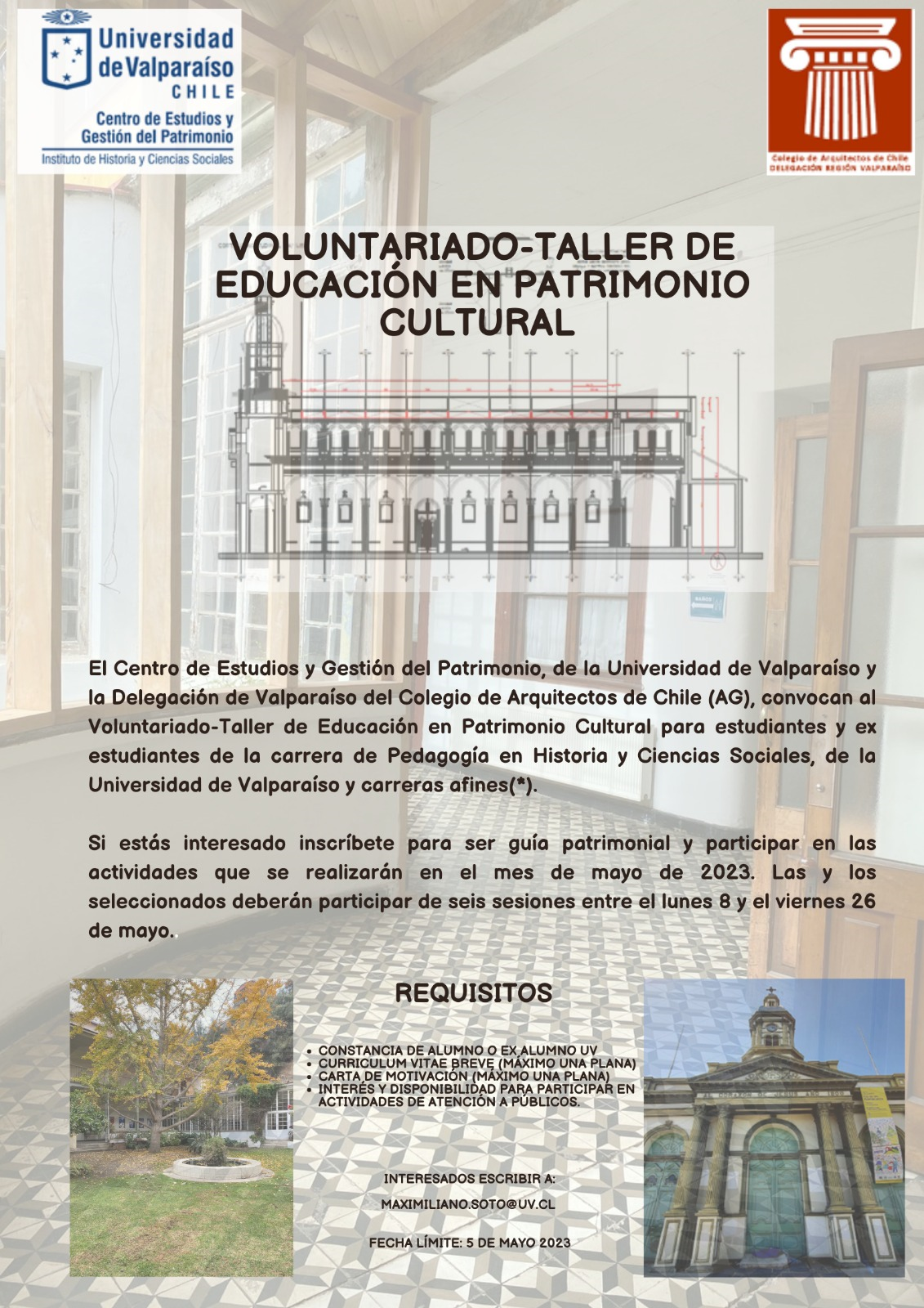 El Centro de Estudios y Gestión del Patrimonio, de la Universidad de Valparaíso, y la Delegación de Valparaíso del Colegio de Arquitectos de Chile (AG), convocan a un Voluntariado-Taller de Educación en Patrimonio Cultural para estudiantes y ex estudiantes de la carrera de Pedagogía en Historia y Ciencias Sociales, de la Universidad de Valparaíso y carreras afines.
