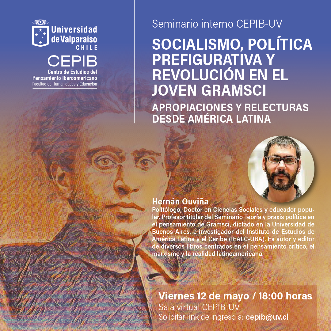 Estimadas y estimados, les extendemos una cordial invitación a la charla titulada "Socialismo, política prefigurativa y revolución en el joven Gramsci: apropiaciones y relecturas desde américa latina", que será dictada por el profesor Hernán Ouviña. Esta actividad se llevará a cabo el viernes 12 de mayo a las 18:00 horas en la sala virtual del CEPIB-UV. los que quieran participar pueden utilizar el siguiente link: