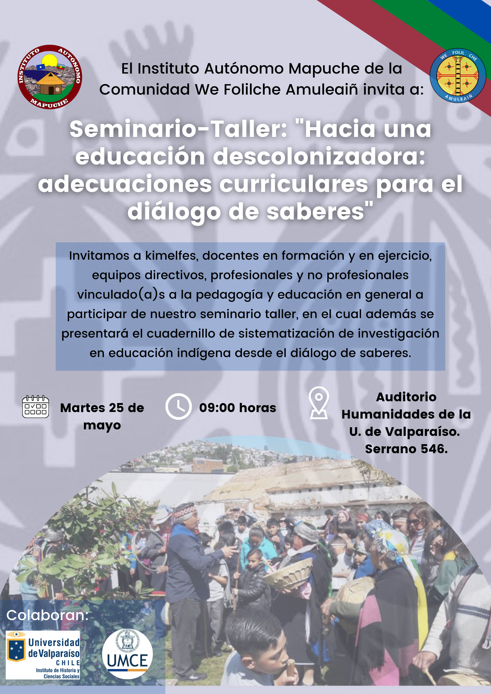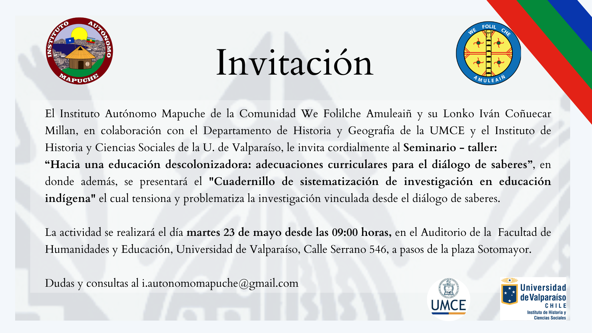 Marhi Marhi kom pu che, esperando que se encuentren muy bien, les escribimos para invitarles al Seminario – Taller “Hacia una educación descolonizadora: adecuaciones curriculares para el diálogo de saberes” y presentación de cuadernillo: Sistematización de la experiencia investigativa en educación indígena. Se adjunta además link para inscripción: https://forms.gle/eRMuz5E3BoXj47Hx6 Esta actividad es organizada por la Comunidad Mapuche We Folilche Amuleaiñ de la ciudad de Valparaíso, y en ella participa como colaborador el Instituto de Historia y Ciencias Sociales de la Universidad de Valparaíso.