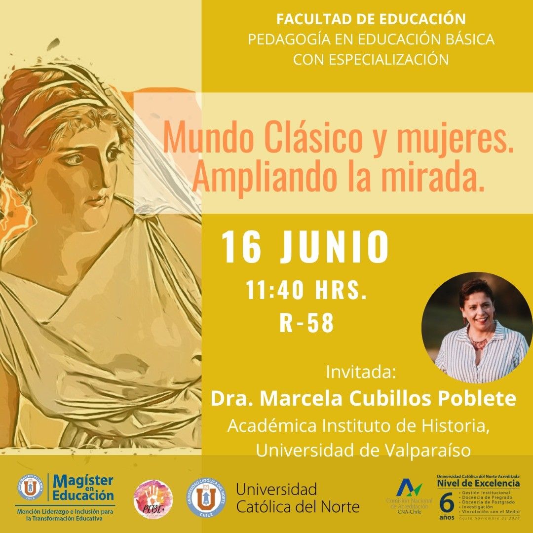 La primera está dirigida a la carrera de Pedagogía en Educación Básica con Especialización y abierta a la comunidad: "Mundo Clásico y mujeres. Ampliando la mirada". Ofreciendo una visión renovada del período, donde el papel de las mujeres fue mucho más activo de lo que se tiende a decir desde la historiografía tradicional, rescatando el nombre, obras y/o participación, de diversas mujeres relevantes, a menudo invisibilizadas por la mirada patriarcal hacia la Historia. Así se detendrá desde los ámbitos de desempeño femeninos, tales como la vida doméstica (madres), la inspiración (musas), religiosidad (divinidades, instituciones y ritos), iconografía, literatura, ‘ciencias’, entre otros, sin olvidar la 'micro política', visión que acoge un concepto más contemporáneo, perfectamente aplicable a la Antigüedad, donde mujeres como Aspacia, Cornelia, Fulvia, Livia y tantas otras, fueron claves a la hora de participar en las decisiones políticas de sus parejas o maridos.