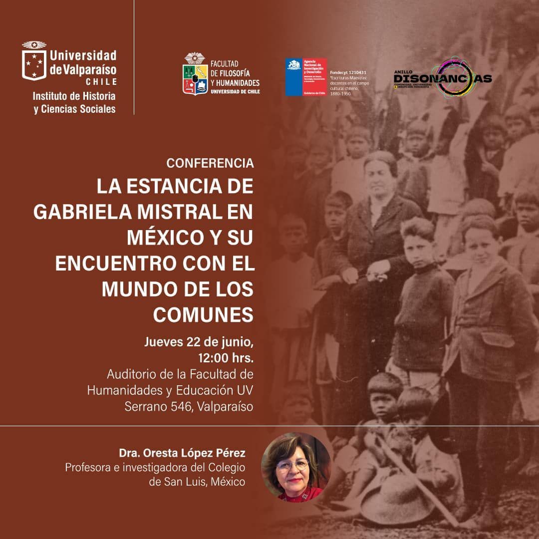 Actividad del proyecto Fondecyt 1210431 "Escrituras de Maestras docentes en el campo cultural chileno, 1880 - 1950", conferencia dictada por la Dra. Oresta López Pérez, profesora e investigadora del Colegio San Luis de México, "La estancia de Gabriela Mistral en México y su encuentro con el mundo de los comunes", el día jueves 22 de junio a las 12:00 hrs. en el auditorio de la Facultad.