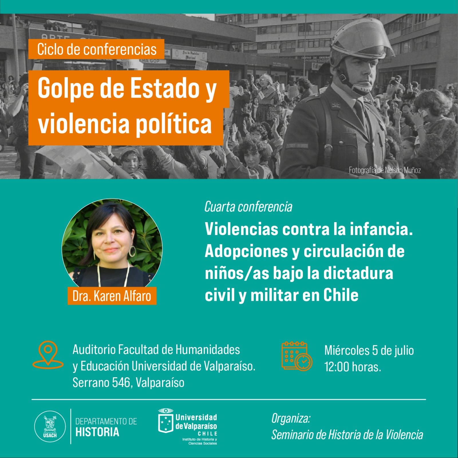 Dentro de las actividades del Ciclo "Golpe de Estado y Violencia Política", el miércoles 5 de julio a las 12:00 horas se dictará la conferencia "Violencias contra la infancia. Adopciones y circulación de niños/as bajo la dictadura civil y militar en Chile."