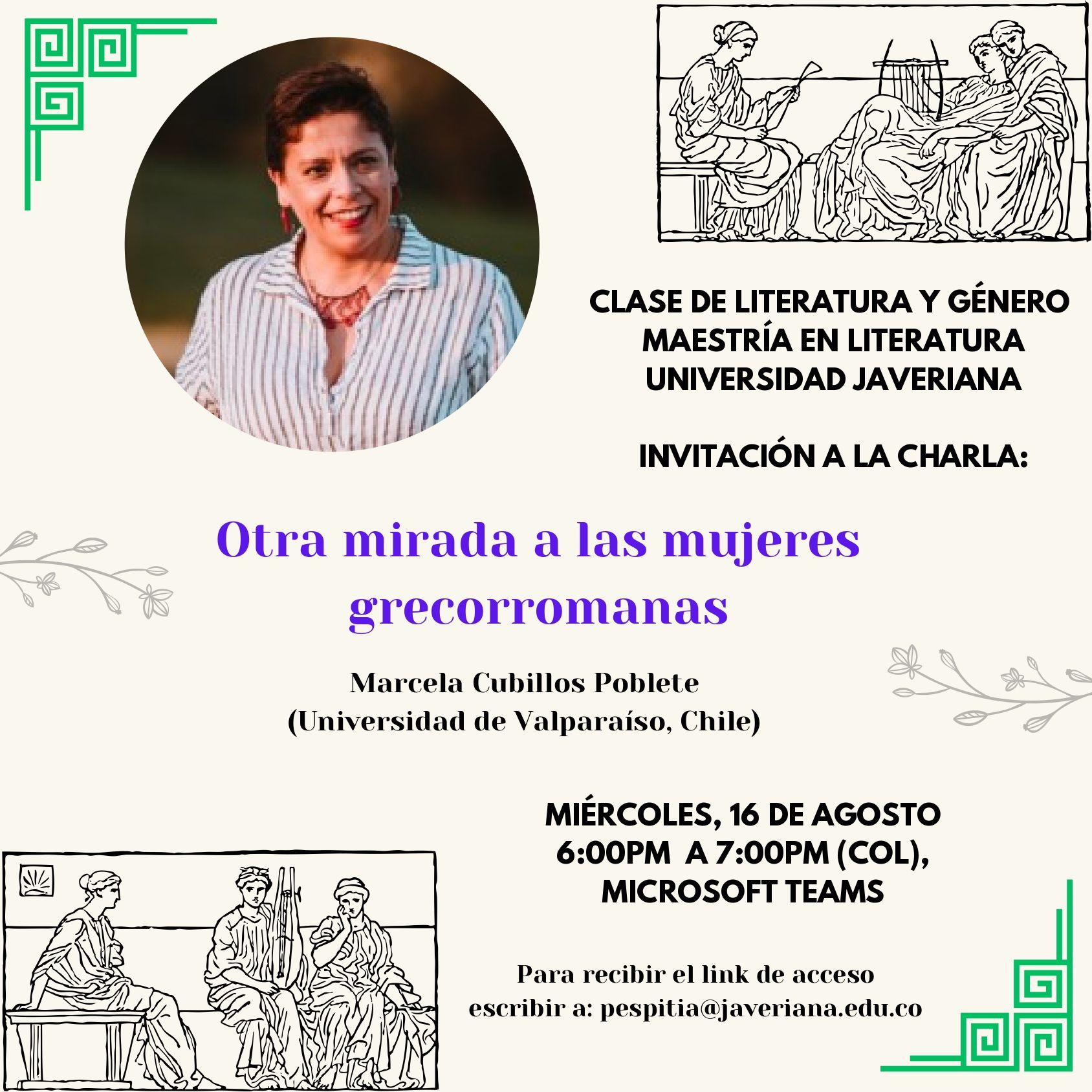 Conferencia en formato remoto "Otra mirada a las mujeres grecorromanas" para la Maestría en el grado de Literatura de la Pontificia Universidad Javeriana de Colombia. Actividad solicitada por la académica de dicha Universidad, la Dra. Pilar Espitia, con quien recientemente hicimos un Live en Instagram "La naturaleza en el Medioevo". Cfr. Live instagram .La charla se realizará por Teams y será abierta a la comunidad. Interesados deben escribir (como indica el afiche adjunto) a Esta dirección de correo electrónico está siendo protegida contra los robots de spam. Necesita tener JavaScript habilitado para poder verlo. y solicitar el link. Además como el tema sirve a lxs estudiantes de mi asignatura de Mundo Antiguo remedial, invité a lxs estudiantes. Fecha-hora: Miércoles 16 agosto, 19hrs. Chile - 18 hrs. Bogotá, Colombia.
