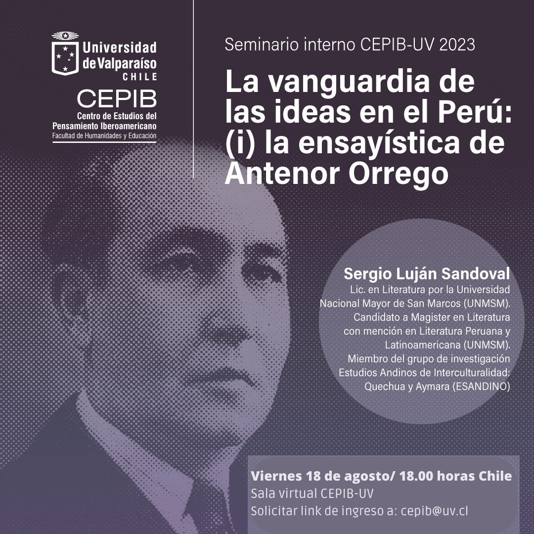 Les informamos que el próximo viernes 18 de agosto a las 18:00 horas, tendremos el honor de recibir en nuestro seminario al investigador Sergio Luján Sandoval, proveniente de Perú. En esta ocasión, el Sr. Luján Sandoval presentará su ponencia titulada "La vanguardia de las ideas en el Perú: (i) la ensayística de Antenor Orrego".