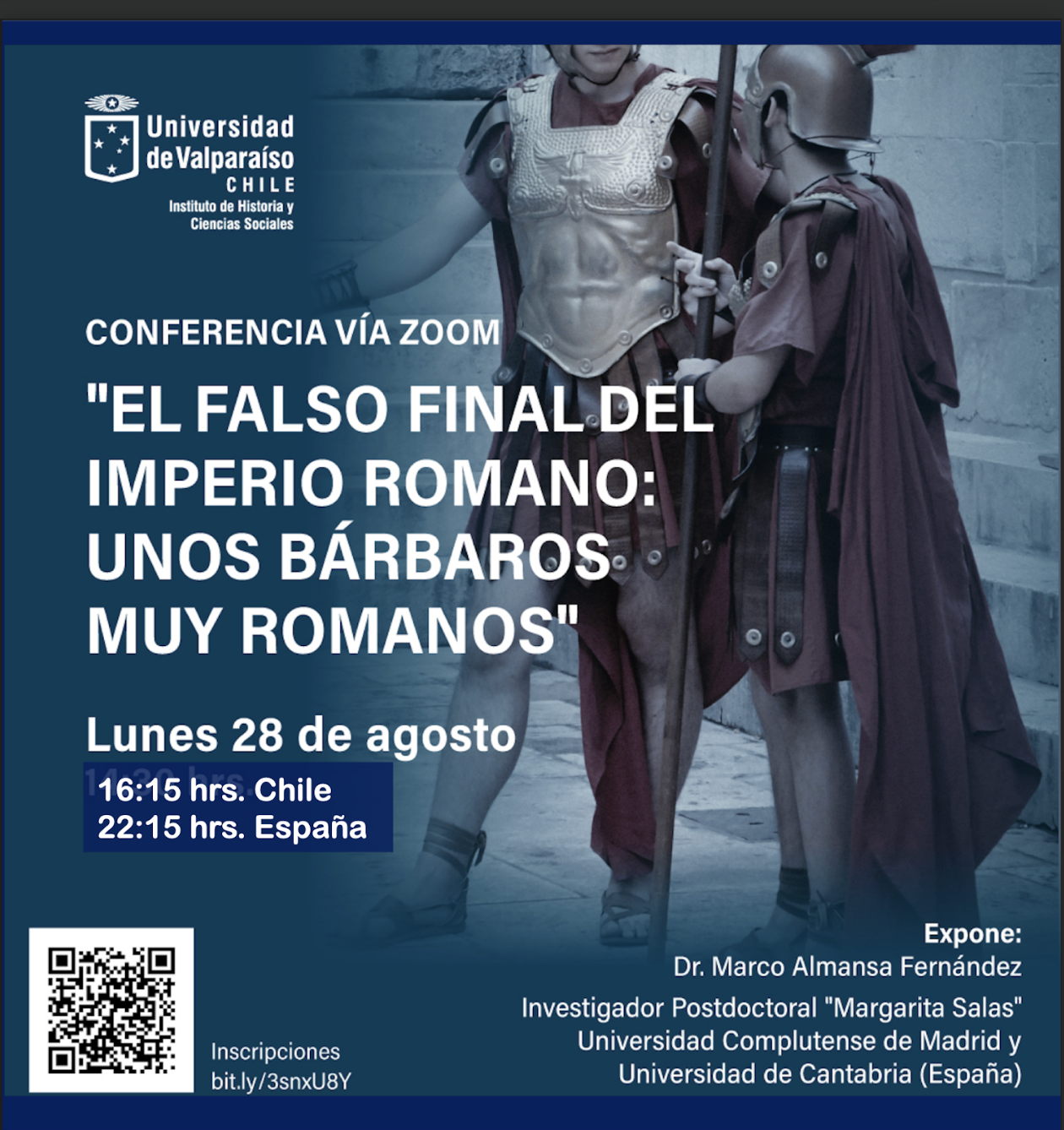 La conferencia se desarrolló vía zoom según lo convenido. En ella el profesor invitado Dr. Almarsa abordó la importancia del ejército y la barbarización del mismo como razón asociada al "fin del Imperio Romano", perspectiva que en la actualidad la historiografía debate dado que, en rigor, dicho Imperio no concluye completamente en el siglo V d.C. porque una parte continúa en Oriente a través del imperio romanorum graecorum, conocido desde 1557 como "Imperio Bizantino", creación del historiador alemán Hieronymus Wolf.