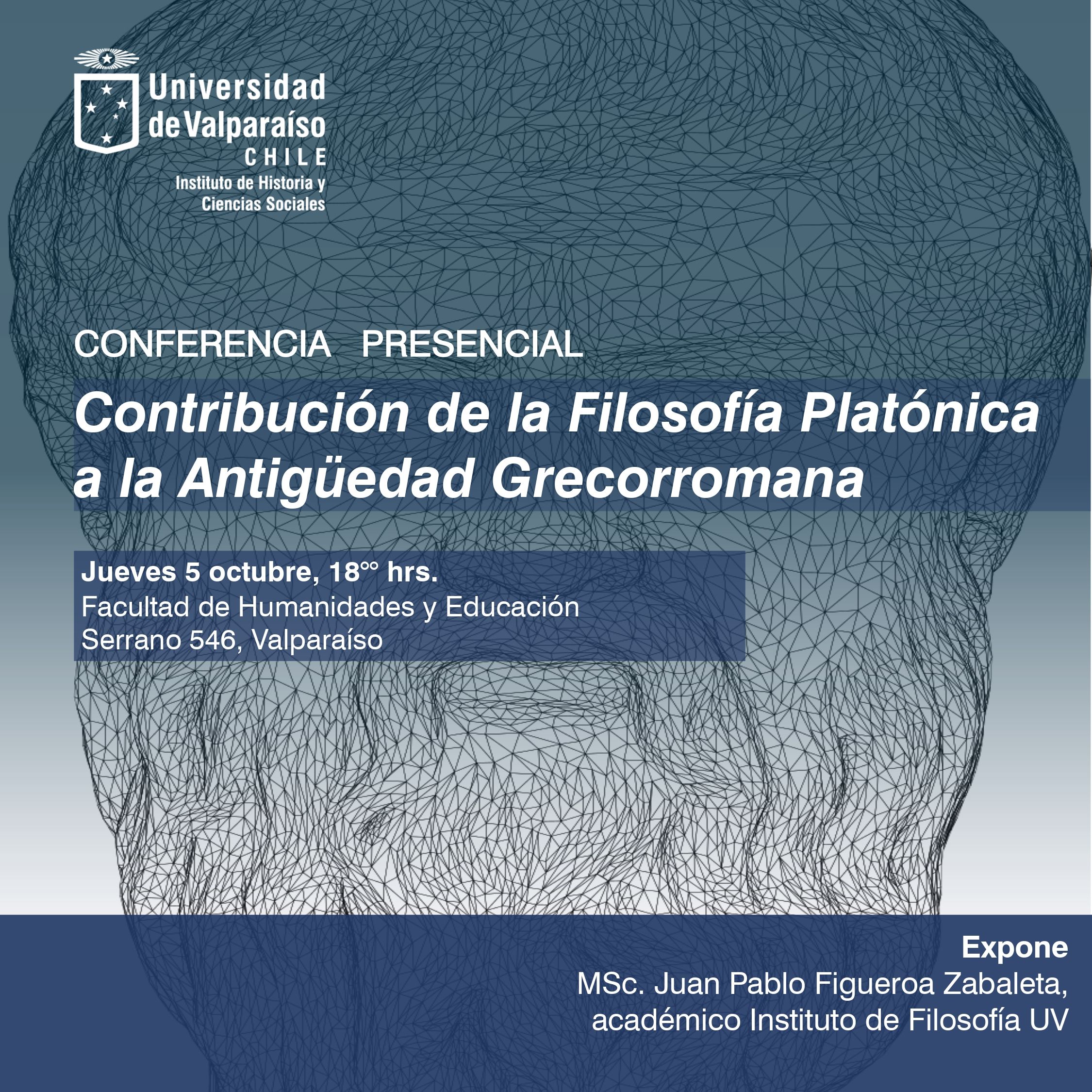 Contribución de la Filosofía Platónica a la Antigüedad Grecorromana MSc. Juan Pablo Figueroa Zabaleta, académico Instituto de Filosofía ,UV jueves 5 octubre, 18 hrs. , sala 5, Serrano 546, Facultad de Humanidades y Educación.