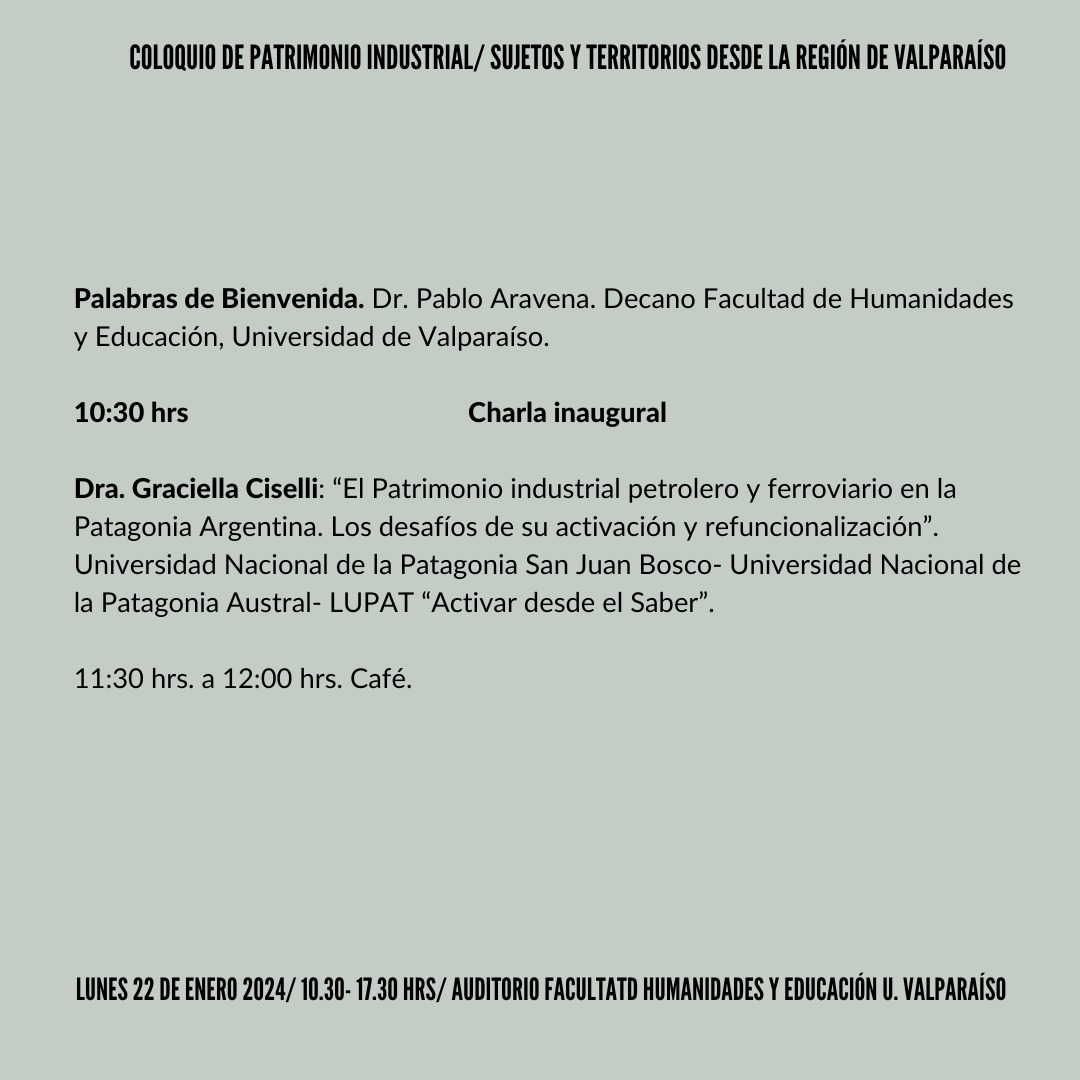 Tendremos, además, la visita de dos grandes investigadores y docentes de Argentina, quienes lideran un interesante proyecto sobre gestión e investigación del patrimonio con una significativa vinculación territorial en la ciudad de Comodoro Rivadavia, la Dra. Graciela Ciselli, académica argentina de las universidades Nacional de la Patagonia San Juan Bosco y la Universidad Nacional de la