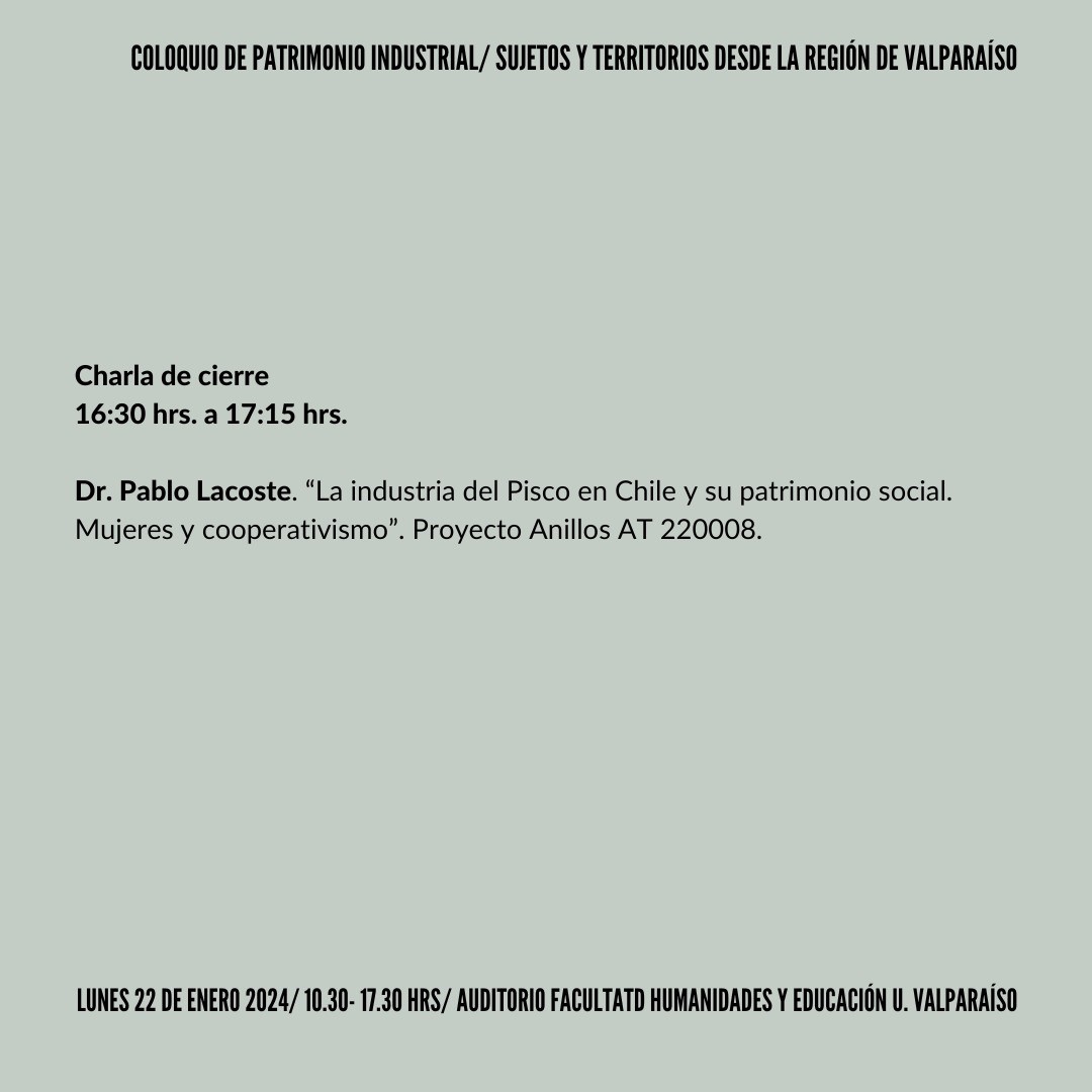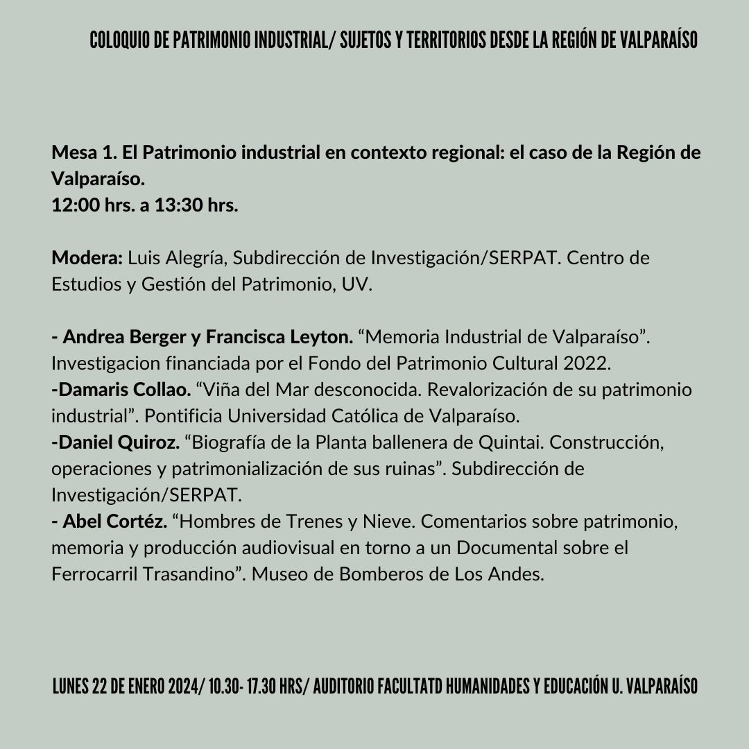 Con ellos, investigadores de Valparaíso: Pamela Fuentes y Marion Steiner; Andrea Berger y Francisca Leyton; Damaris Collao; y Abel Cortéz, junto a investigadores del país, Daniel Quiroz y Pía Acevedo y Rosario Medina, dialogarán a través de sus experiencias sobre memorias del trabajo, industrias y gestión patrimonial.