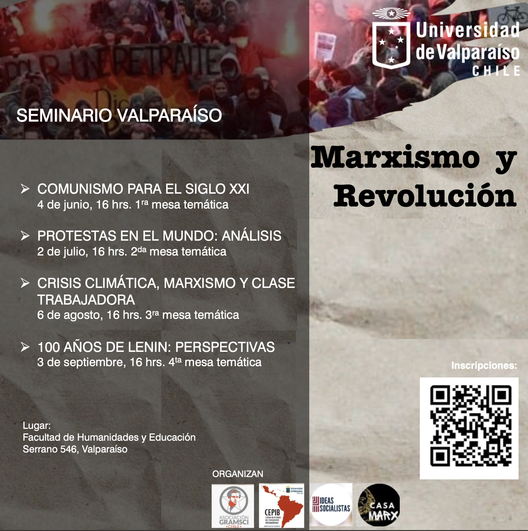 Las sesiones se desarrollarán en el Auditorio (4to piso) de la Facultad. Convoca CEPIB, asociación Gramsci Chile, ideas Socialista y Casa Marx. Además se ofrece una constancia de asistencia, a quienes cumplan el 100%.