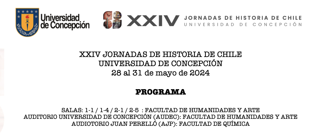 Entre los días 28 y 31 de mayo se desarrollaron las XXIV JORNADAS DE HISTORIA DE CHILE en la ciudad de Concepción, organizada en este 2024 por la Universidad de Concepción. El evento reunió un alto número de especialistas nacionales que abordaron variadas temáticas atingentes a la Historia de nuestro país, desde la Historia de la Iglesia en Chile, la Historia de la construcción habitacional e Infraestructura Urbana, la Historia y representaciones afrodescendientes en Chile desde la Conquista hasta el Centenario, entre tantos otros. Cfr. www.