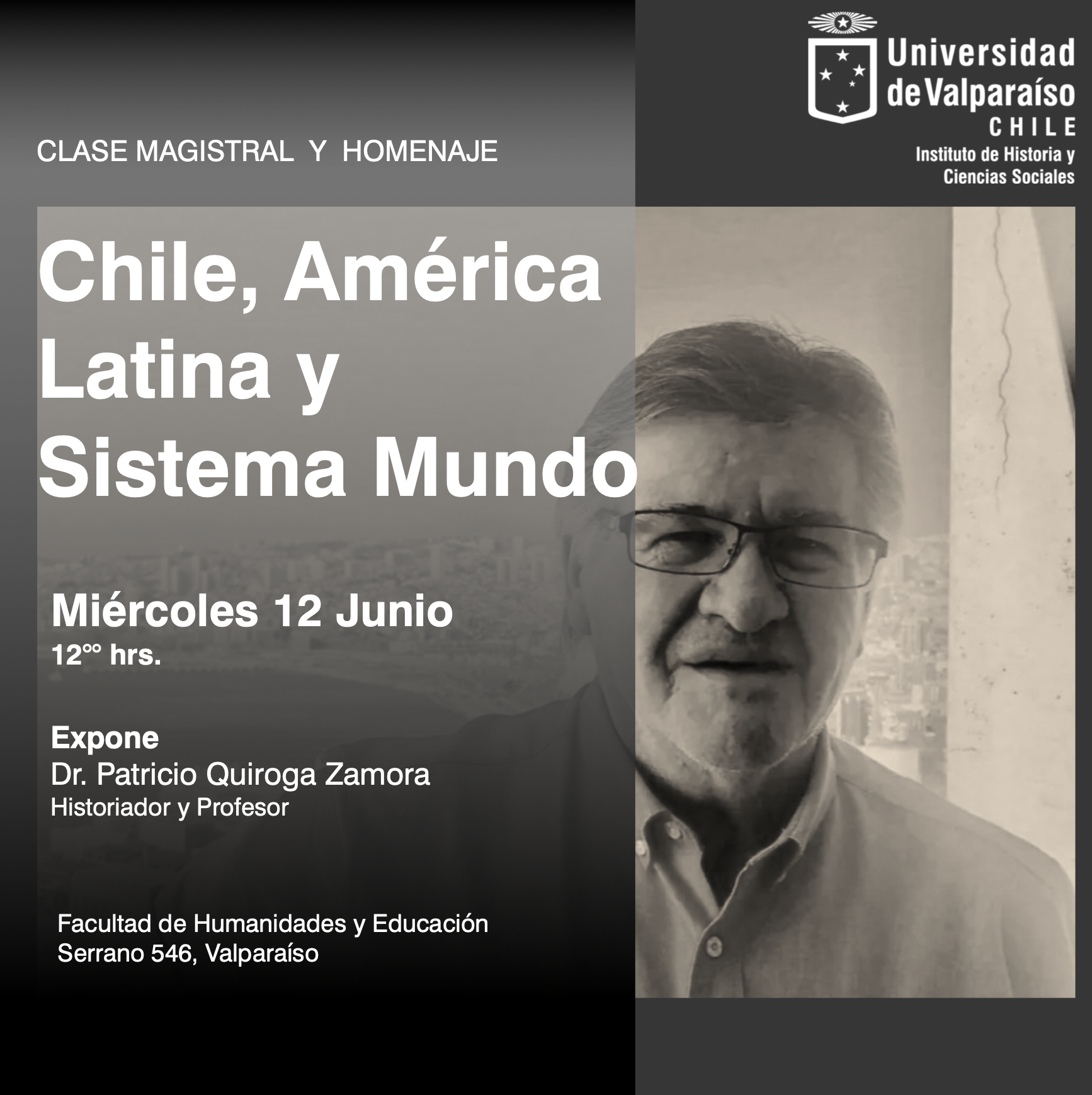 Estimada Comunidad, invitamos cordialmente a la Clase Magistral "Chile, América Latina y Sistema Mundo", a cargo del Dr. Patricio Quiroga Zamora y al homenaje que le haremos ya que el Profesor Quiroga fue académico del Instituto de Historia y Cs. Sociales por muchos años y también dictó clases en otras unidades UV, como la Escuela de Sociología.