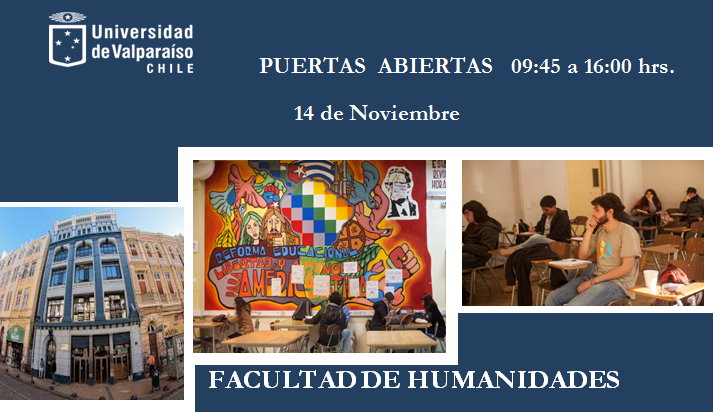 Te invitamos cordialmente a participar del DIA DE PUERTAS ABIERTAS de la Facultad de Humanidades, a desarrollarse el próximo miércoles 14 de noviembre, de 09.45 a 16.00 horas,ubicada en calle Serrano 546, Valparaíso.