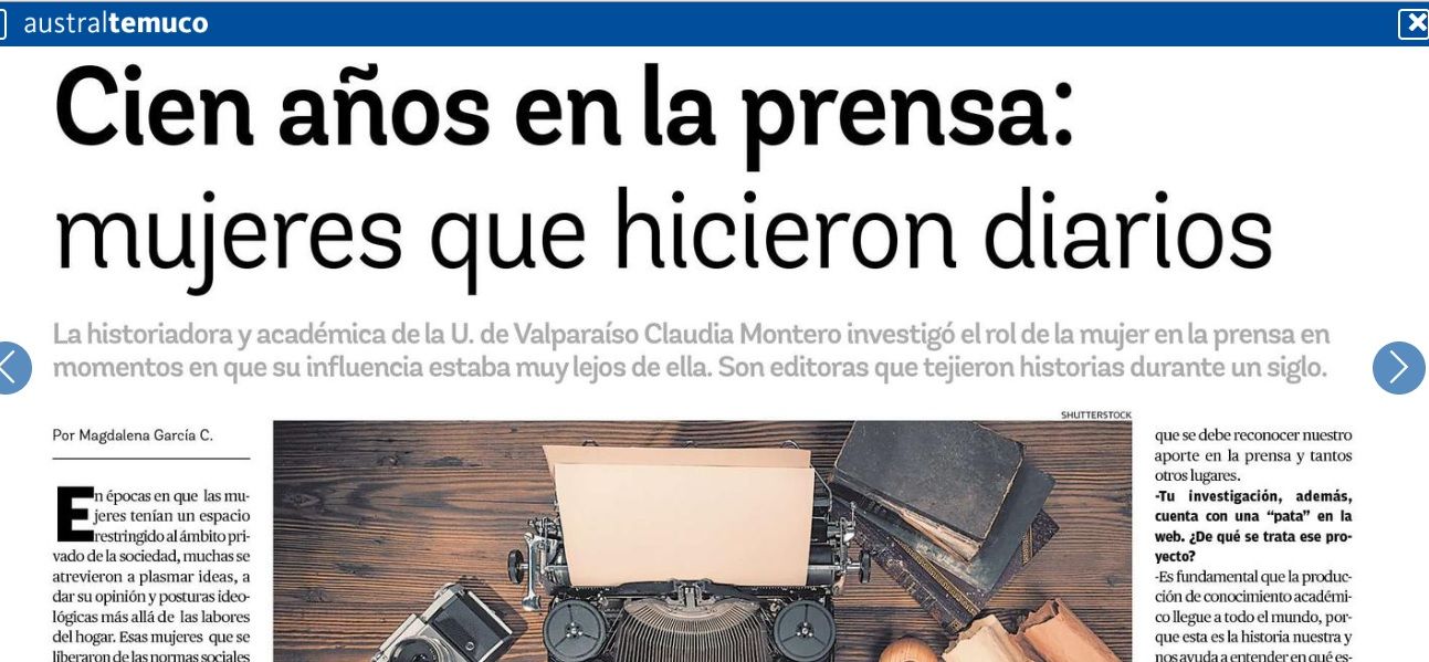 Hoy 12 de agosto en "El Austral. El Diario de la Araucanía" una nota y entrevista a la Profesora Claudia Montero sobre su libro sobre Prensa de Mujeres